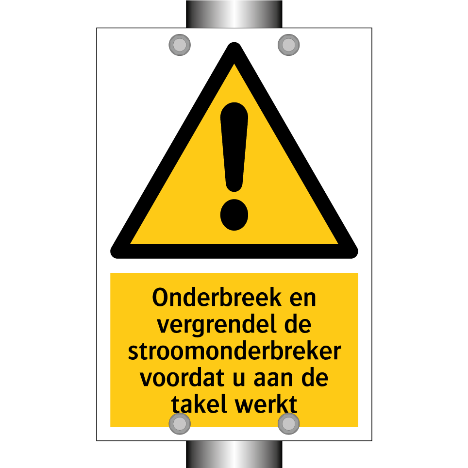 Waarschuwingsbord met de tekst Onderbreek en vergrendel de stroomonderbreker voordat u aan de takel werkt