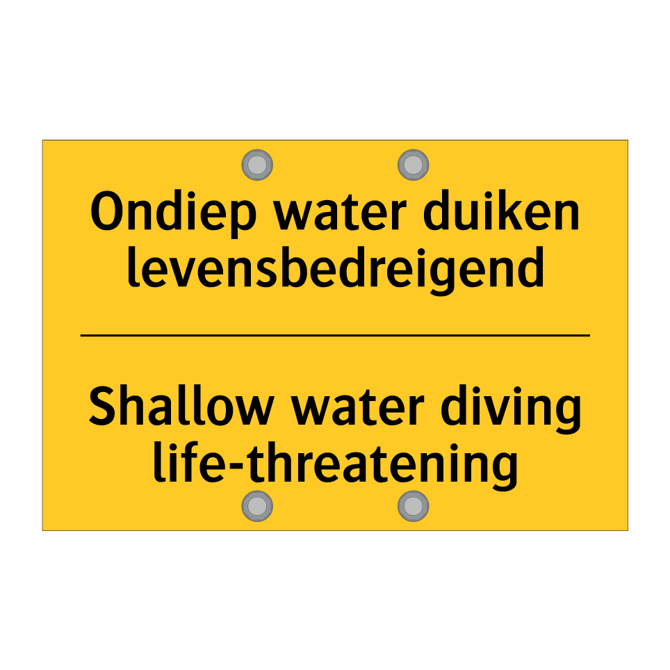 Waarschuwingsbord met de tekst Ondiep water duiken levensbedreigend / Shallow water diving life-threatening