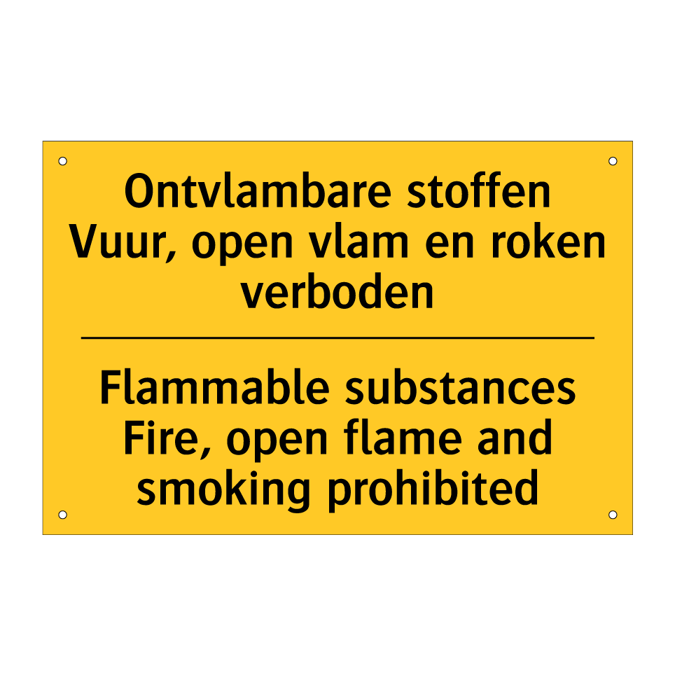 Waarschuwingsbord met de tekst Ontvlambare stoffen Vuur, open vlam en roken verboden / Flammable substances Fire, open flame and smoking prohibited