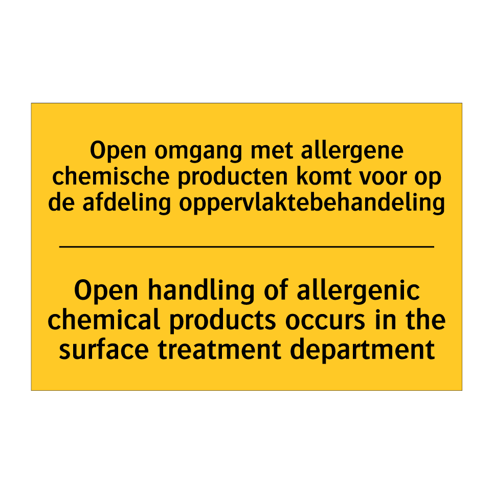 Waarschuwingsbord met de tekst Open omgang met allergene chemische producten komt voor op de afdeling oppervlaktebehandeling / Open handling of allergenic chemical products occurs in the surface treatment department