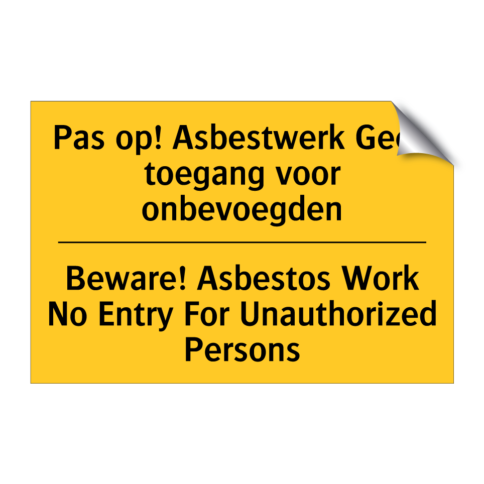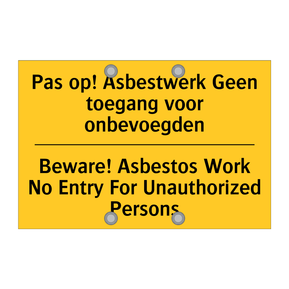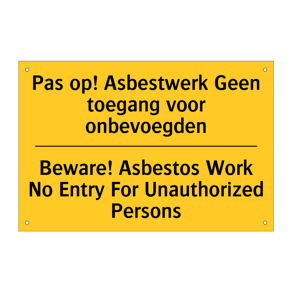 Waarschuwingsbord met de tekst Pas op! Asbestwerk Geen toegang voor onbevoegden / Beware! Asbestos Work No Entry For Unauthorized Persons