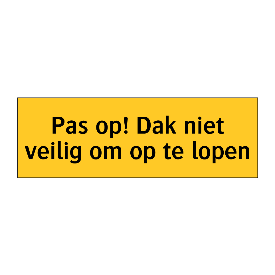 Deze waarschuwingsbord is essentieel voor het waarborgen van de veiligheid op daken. Het bord waarschuwt duidelijk dat het dak niet veilig is om op te lopen, wat helpt om ongelukken en verwondingen te voorkomen. Ideaal voor gebruik op bouwplaatsen, industriële gebouwen en andere locaties waar toegang tot het dak beperkt moet worden. Plaats dit bordje bij ingangen naar het dak, op trappenhuizen of bij ladders om ervoor te zorgen dat iedereen op de hoogte is van het gevaar. De opvallende gele achtergrond en zwarte tekst zorgen ervoor dat de waarschuwing niet over het hoofd wordt gezien.