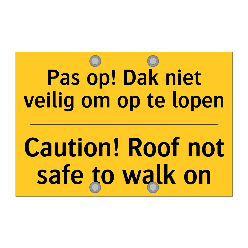 Waarschuwingsbord met de tekst Pas op! Dak niet veilig om op te lopen / Caution! Roof not safe to walk on