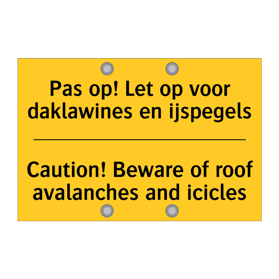 Waarschuwingsbord met de tekst Pas op! Let op voor daklawines en ijspegels / Caution! Beware of roof avalanches and icicles