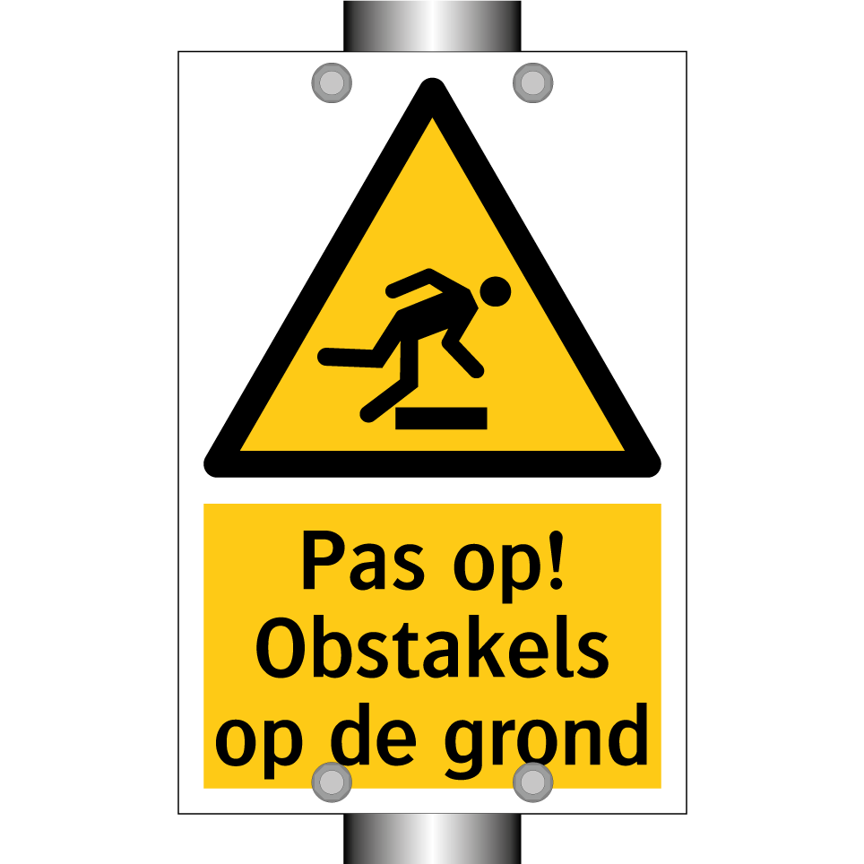 Waarschuwingsbord met de tekst Pas op! Obstakels op de grond