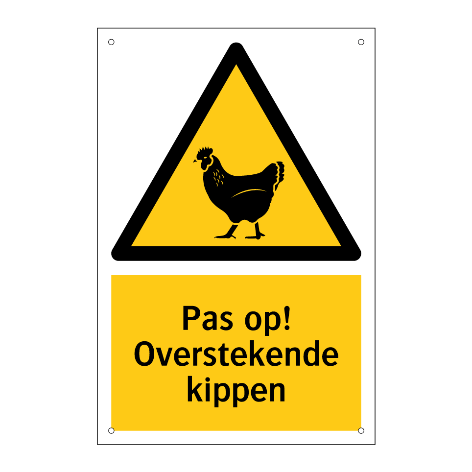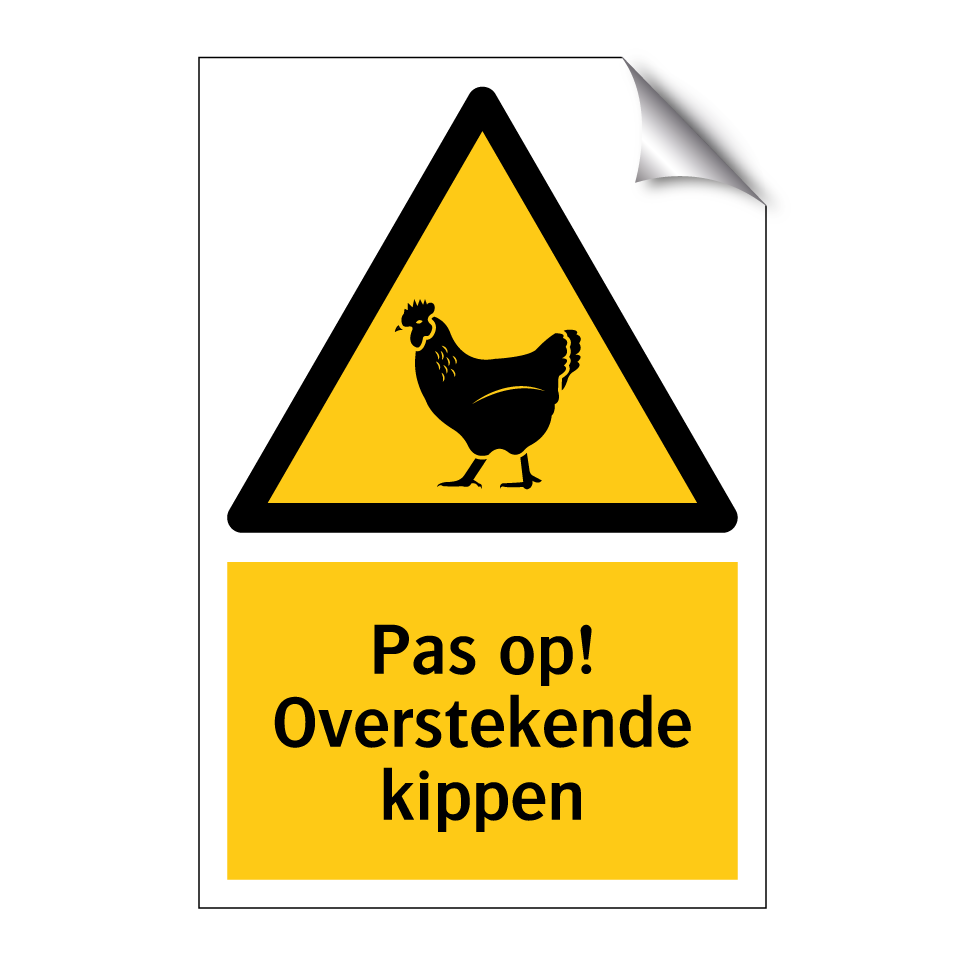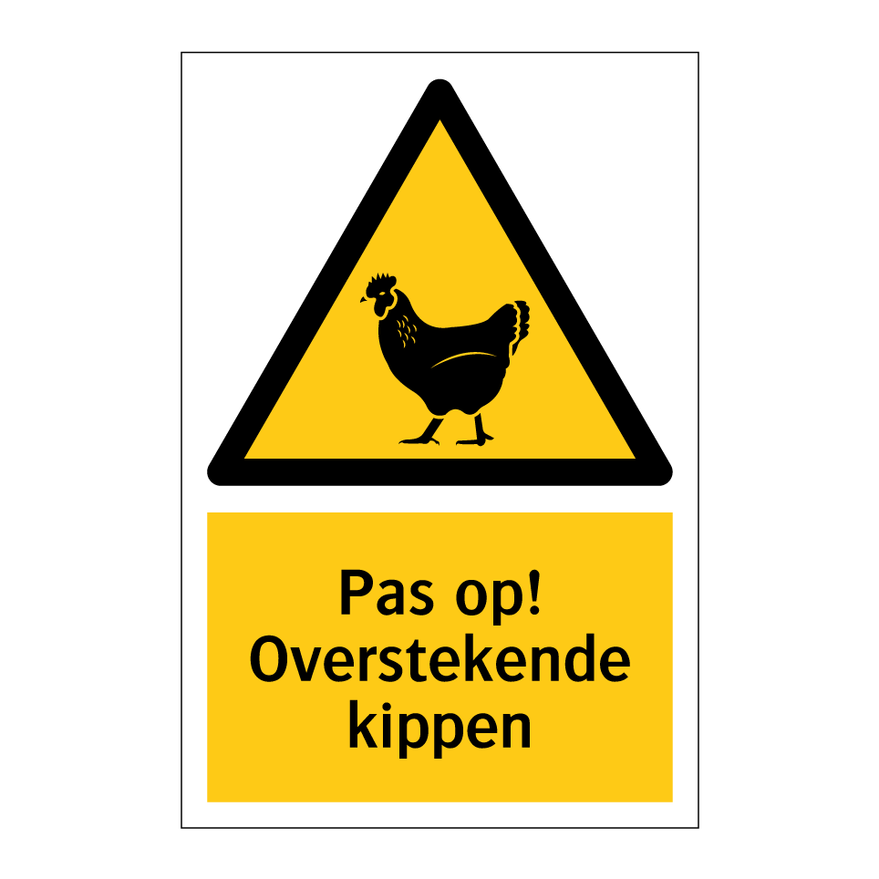 Waarschuwingsbord met de tekst Pas op! Overstekende kippen