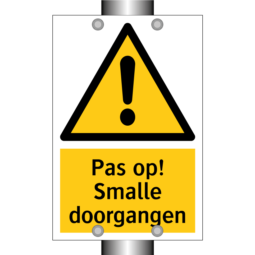 Waarschuwingsbord met de tekst Pas op! Smalle doorgangen