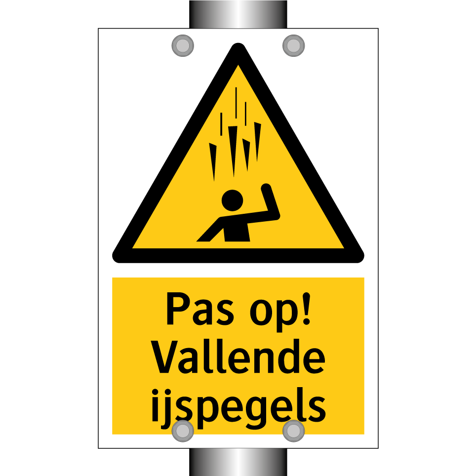 Deze waarschuwingsbord is essentieel voor het waarborgen van de veiligheid in gebieden waar ijspegels kunnen vallen. Plaats deze bord op strategische locaties zoals ingangen van gebouwen, onder dakranden, of in smalle doorgangen waar het risico op vallende ijspegels groot is. Door deze waarschuwingsbord te gebruiken, kunt u voorbijgangers effectief waarschuwen voor het gevaar van vallende ijspegels en zo ongelukken voorkomen. Ideaal voor gebruik in zowel stedelijke als landelijke omgevingen, deze bord helpt om de veiligheid van voetgangers en werknemers te waarborgen. Zorg ervoor dat iedereen op de hoogte is van het potentiële gevaar met deze duidelijke en opvallende waarschuwingsbord.
