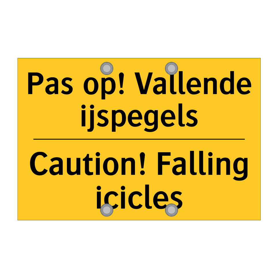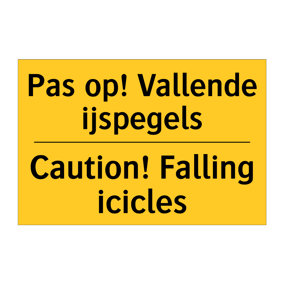 Waarschuwingsbord met de tekst Pas op! Vallende ijspegels / Caution! Falling icicles