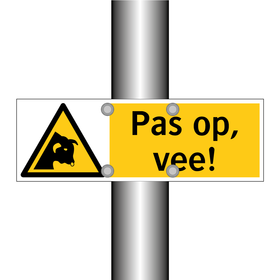 Deze waarschuwingsbord is essentieel voor het waarborgen van de veiligheid op boerderijen en andere gebieden waar vee aanwezig is. Plaats deze bord bij ingangen van weilanden, stallen of langs wegen waar dieren vaak oversteken. Het waarschuwt voorbijgangers en chauffeurs om extra voorzichtig te zijn en hun snelheid te verminderen om ongelukken te voorkomen. Dit waarschuwingsbord is ook ideaal voor gebruik op campings of natuurgebieden waar vee vrij rondloopt. Door deze bord strategisch te plaatsen, verhoogt u de bewustwording en draagt u bij aan een veiligere omgeving voor zowel mensen als dieren.