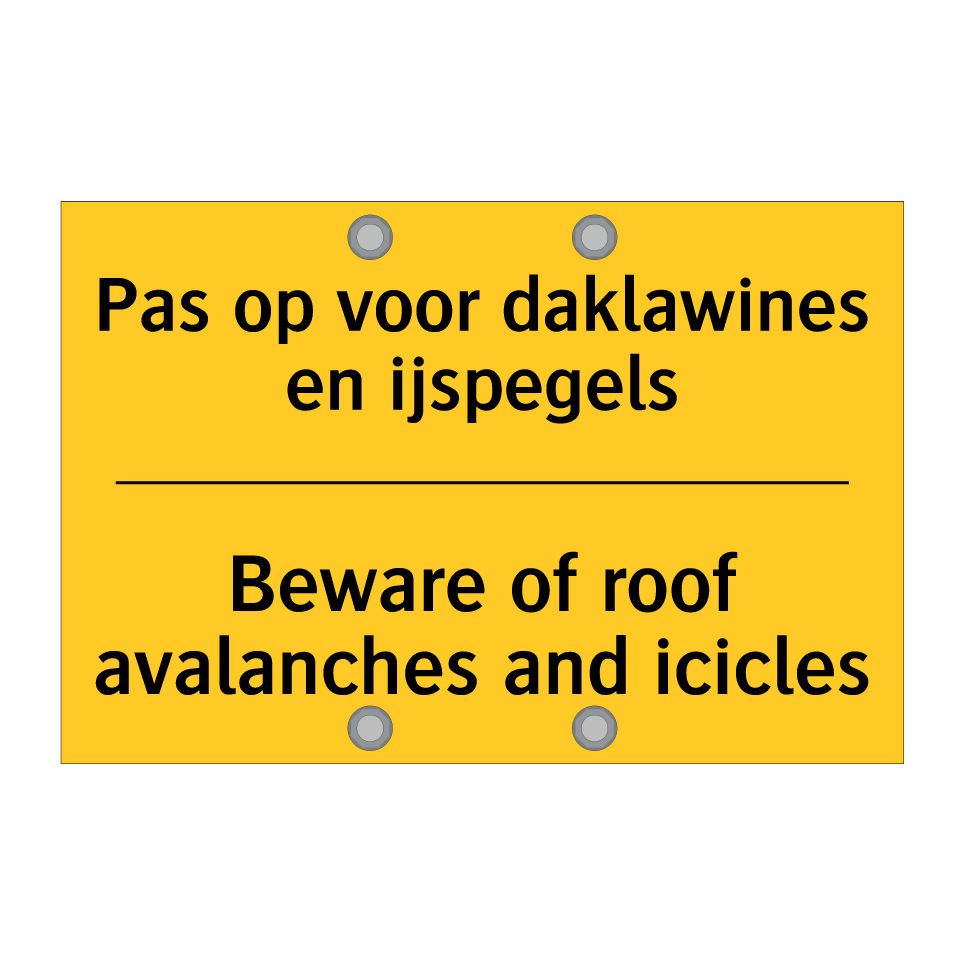 Waarschuwingsbord met de tekst Pas op voor daklawines en ijspegels / Beware of roof avalanches and icicles