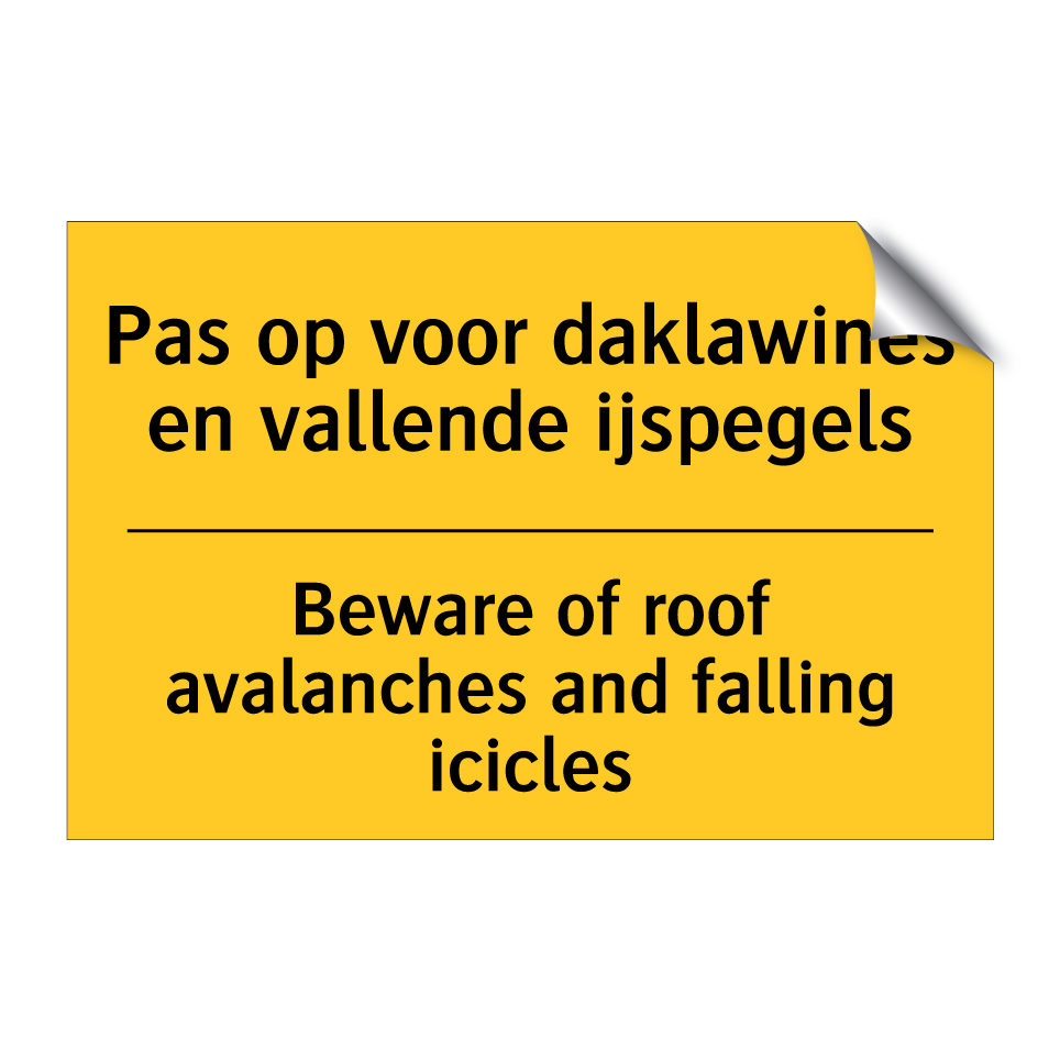 Waarschuwingsbord met de tekst Pas op voor daklawines en vallende ijspegels / Beware of roof avalanches and falling icicles
