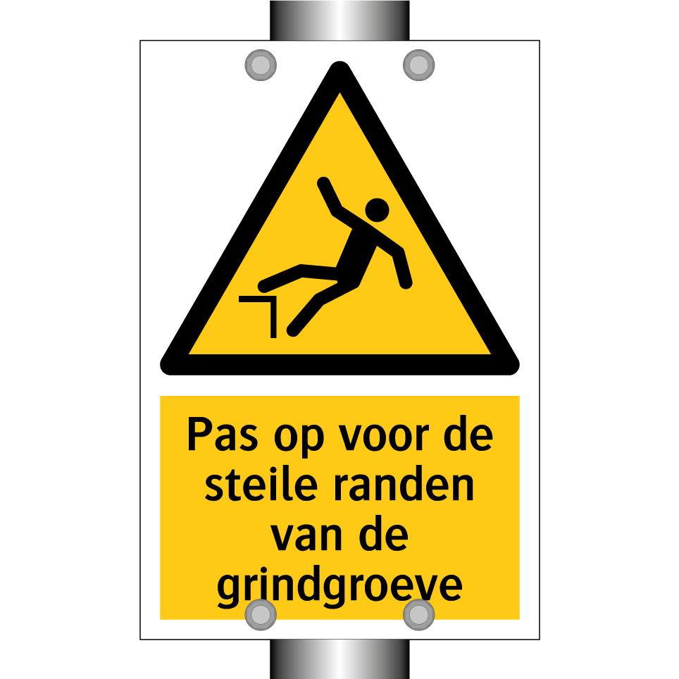 Waarschuwingsbord met de tekst Pas op voor de steile randen van de grindgroeve
