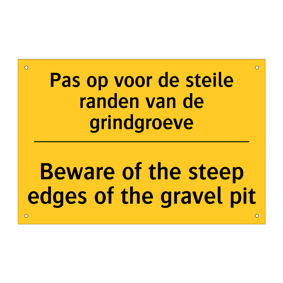 Waarschuwingsbord met de tekst Pas op voor de steile randen van de grindgroeve / Beware of the steep edges of the gravel pit