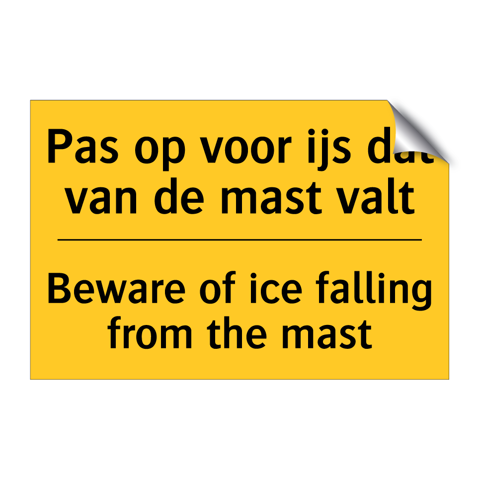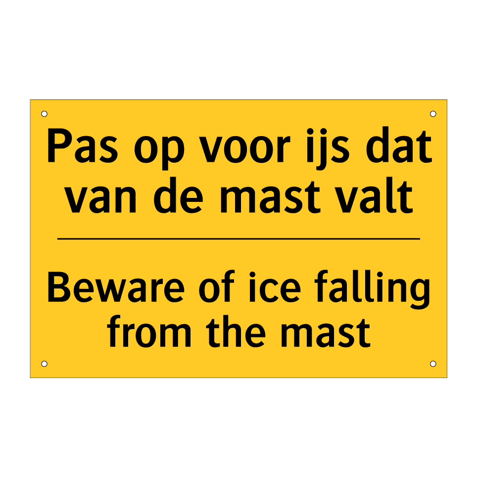 Waarschuwingsbord met de tekst Pas op voor ijs dat van de mast valt / Beware of ice falling from the mast