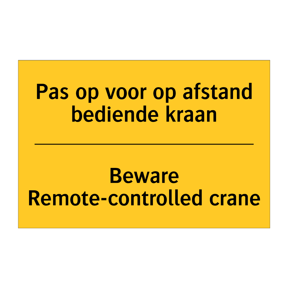 Waarschuwingsbord met de tekst Pas op voor op afstand bediende kraan / Beware Remote-controlled crane