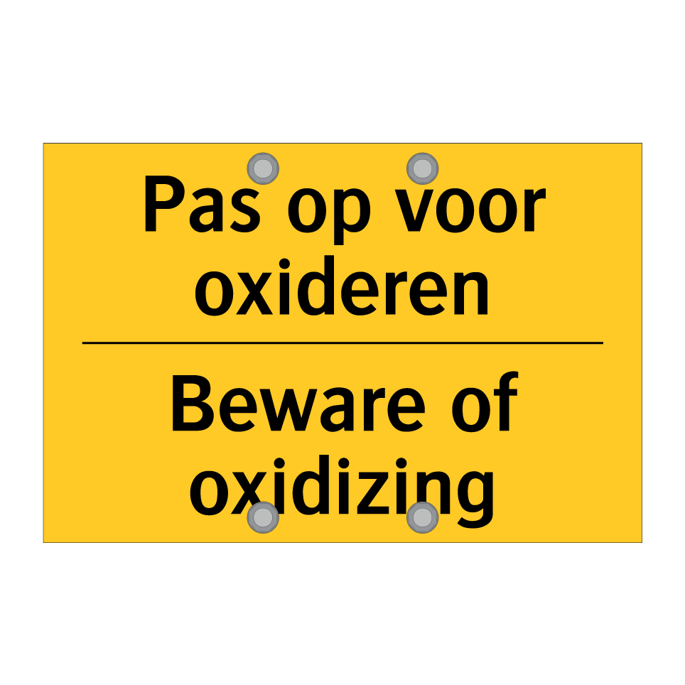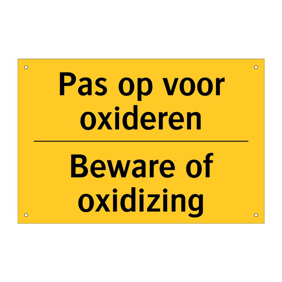 Waarschuwingsbord met de tekst Pas op voor oxideren / Beware of oxidizing