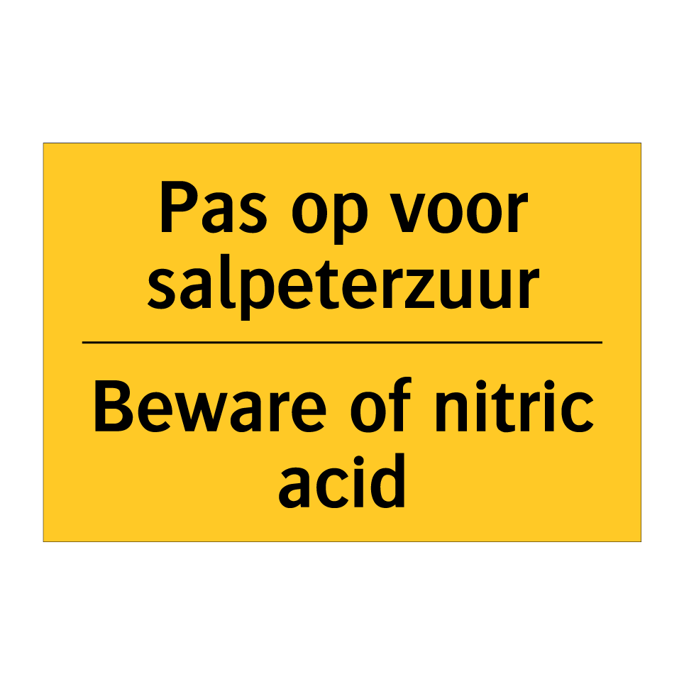 Waarschuwingsbord met de tekst Pas op voor salpeterzuur / Beware of nitric acid