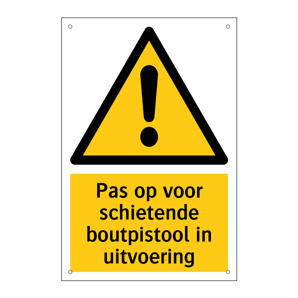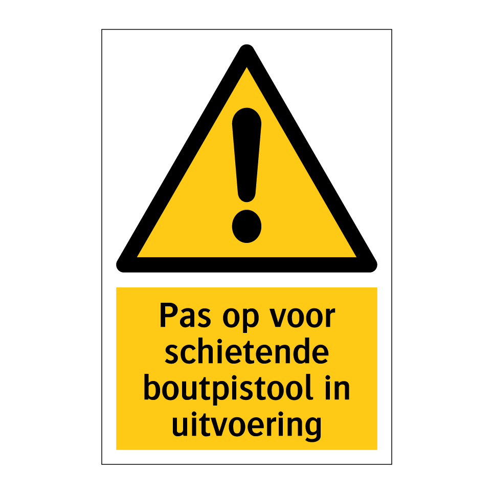 Waarschuwingsbord met de tekst Pas op voor schietende boutpistool in uitvoering