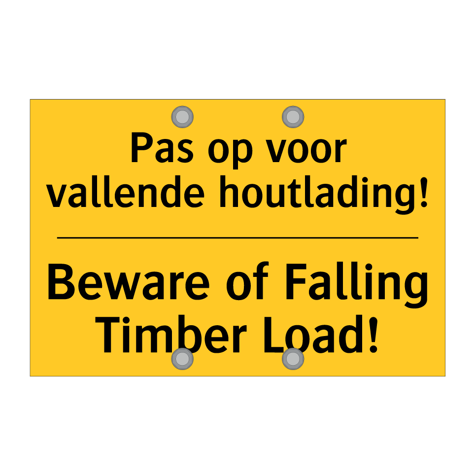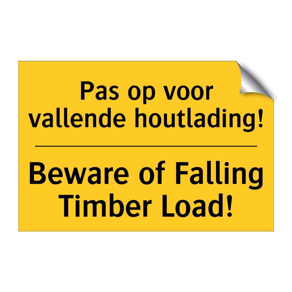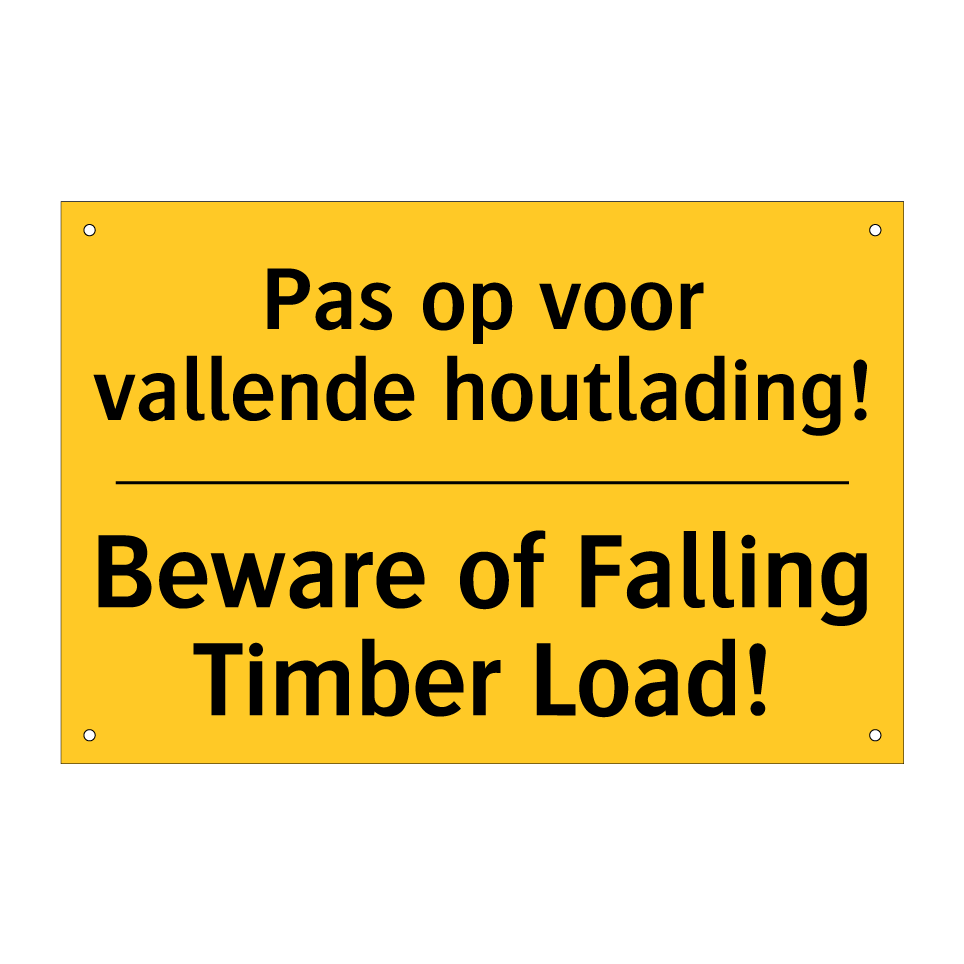 Waarschuwingsbord met de tekst Pas op voor vallende houtlading! / Beware of Falling Timber Load!