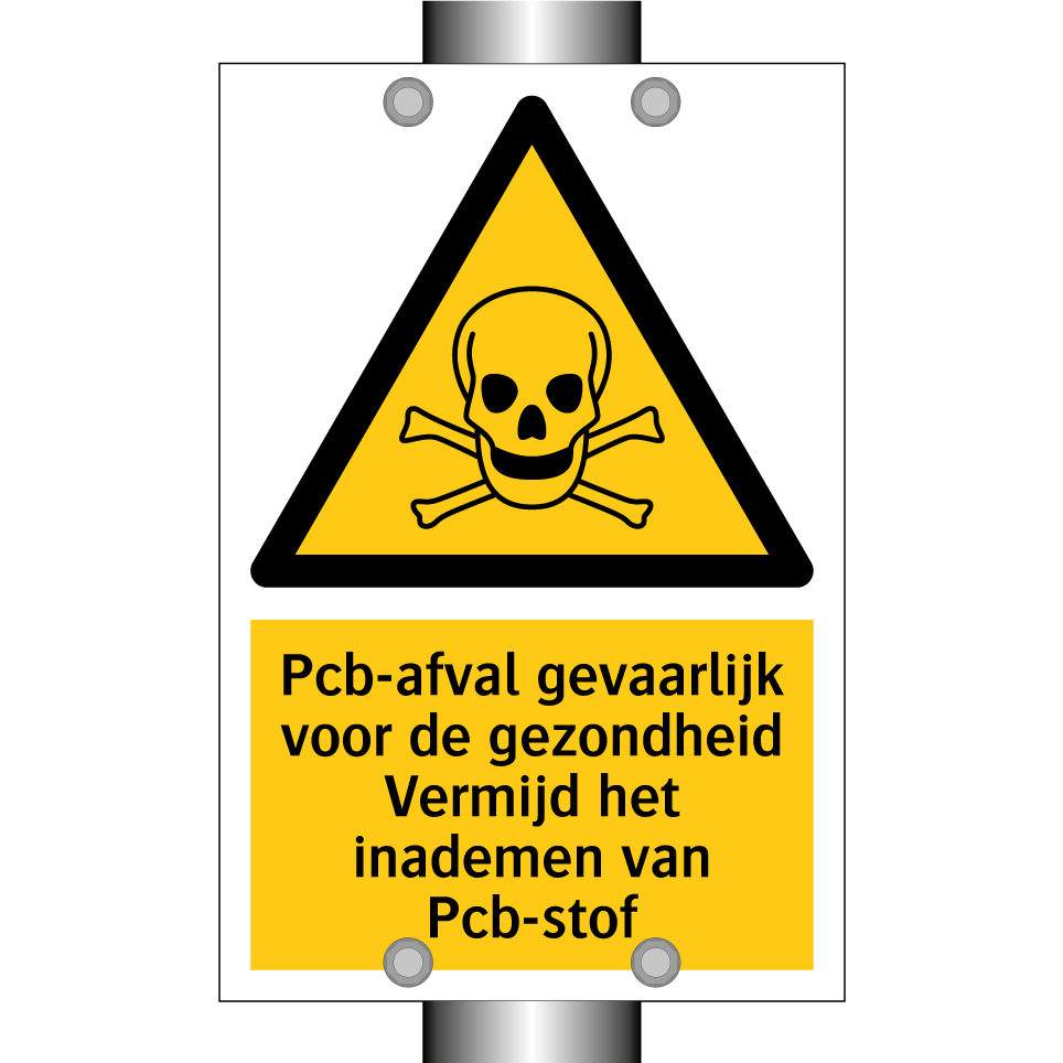 Waarschuwingsbord met de tekst Pcb-afval gevaarlijk voor de gezondheid Vermijd het inademen van Pcb-stof