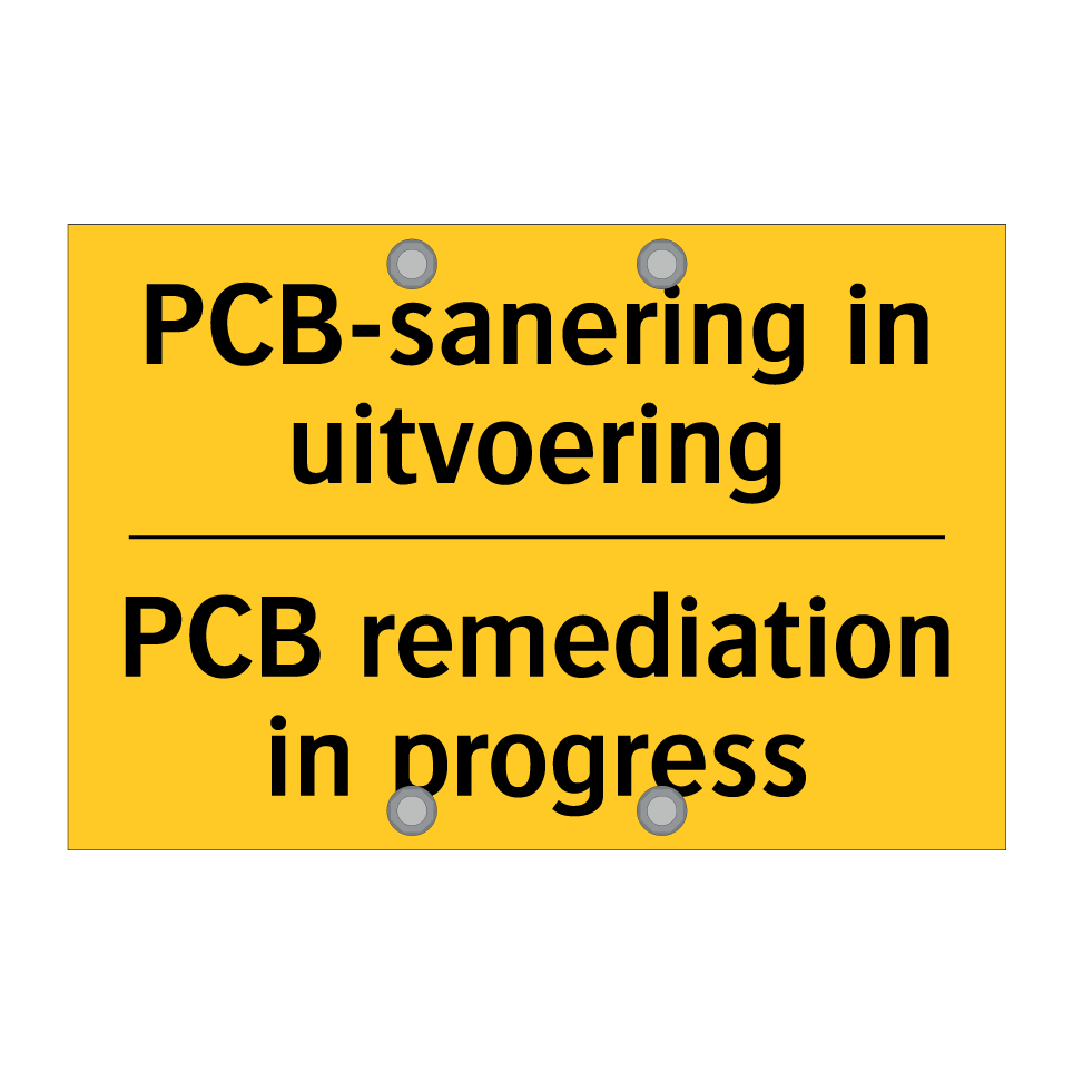 Waarschuwingsbord met de tekst PCB-sanering in uitvoering / PCB remediation in progress