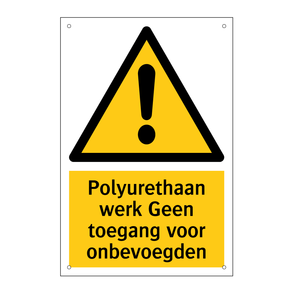Waarschuwingsbord met de tekst Polyurethaan werk Geen toegang voor onbevoegden