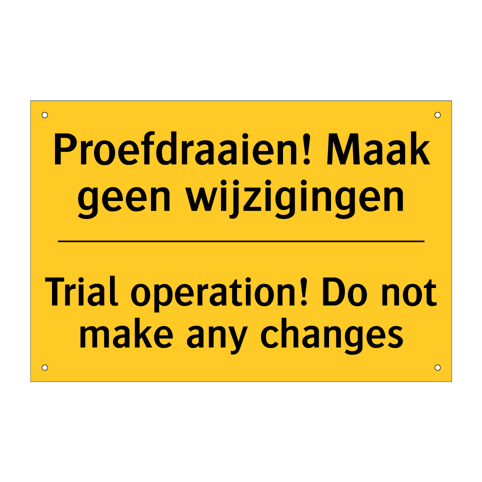 Waarschuwingsbord met de tekst Proefdraaien! Maak geen wijzigingen / Trial operation! Do not make any changes