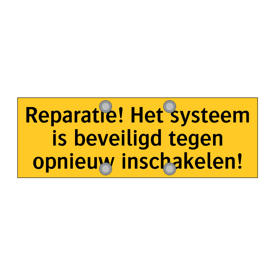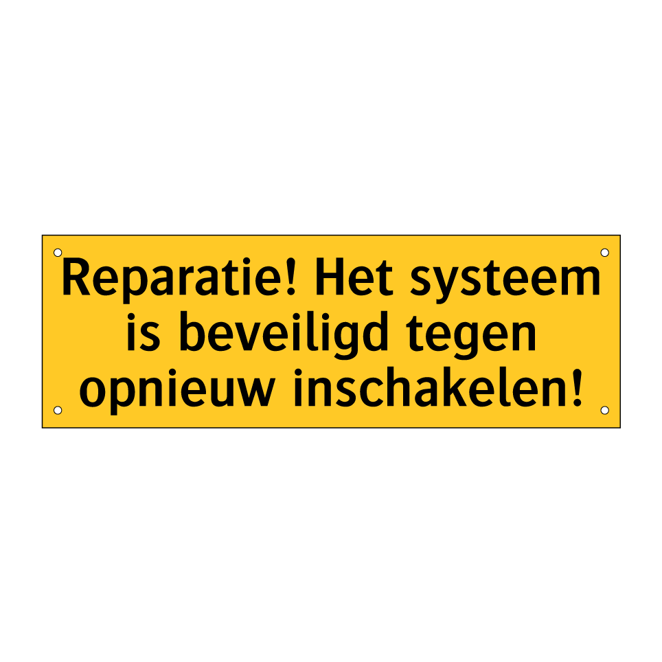 Waarschuwingsbord met de tekst Reparatie! Het systeem is beveiligd tegen opnieuw inschakelen!