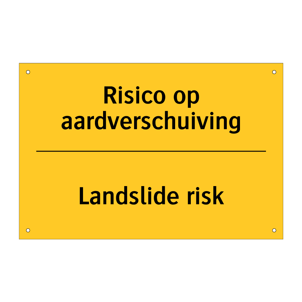 Dit waarschuwingsbord met gele achtergrond en zwarte tekst is essentieel voor het markeren van gebieden met risico op aardverschuivingen. De tweetalige tekst, in zowel Nederlands als Engels, zorgt ervoor dat zowel lokale bewoners als internationale bezoekers de waarschuwing begrijpen. dit bordje is ideaal voor gebruik in bergachtige regio's, bouwplaatsen, en andere risicovolle gebieden waar aardverschuivingen kunnen voorkomen. Door de duidelijke en opvallende kleuren trekt het onmiddellijk de aandacht, wat bijdraagt aan de veiligheid van iedereen in de omgeving. Plaats dit waarschuwingsbord op strategische locaties zoals wandelpaden, toegangswegen, en bouwterreinen om mensen te waarschuwen voor mogelijke gevaren.