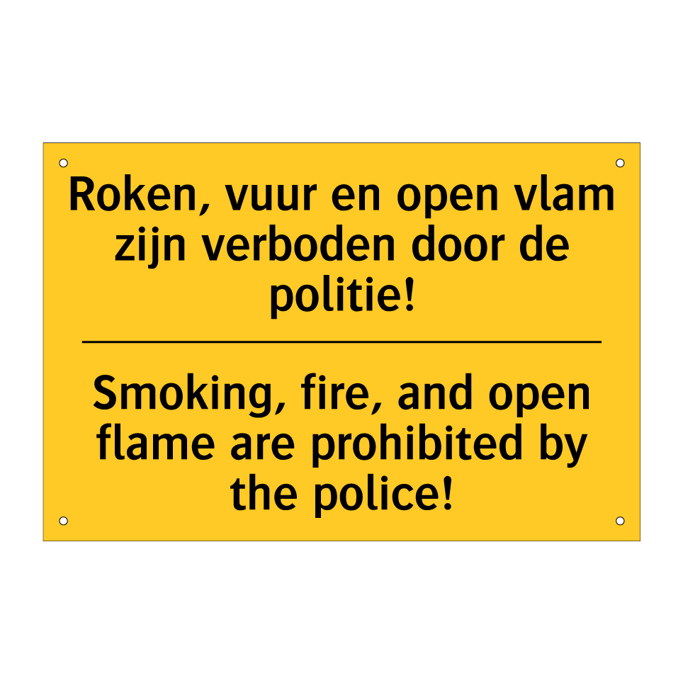 Waarschuwingsbord met de tekst Roken, vuur en open vlam zijn verboden door de politie! / Smoking, fire, and open flame are prohibited by the police!