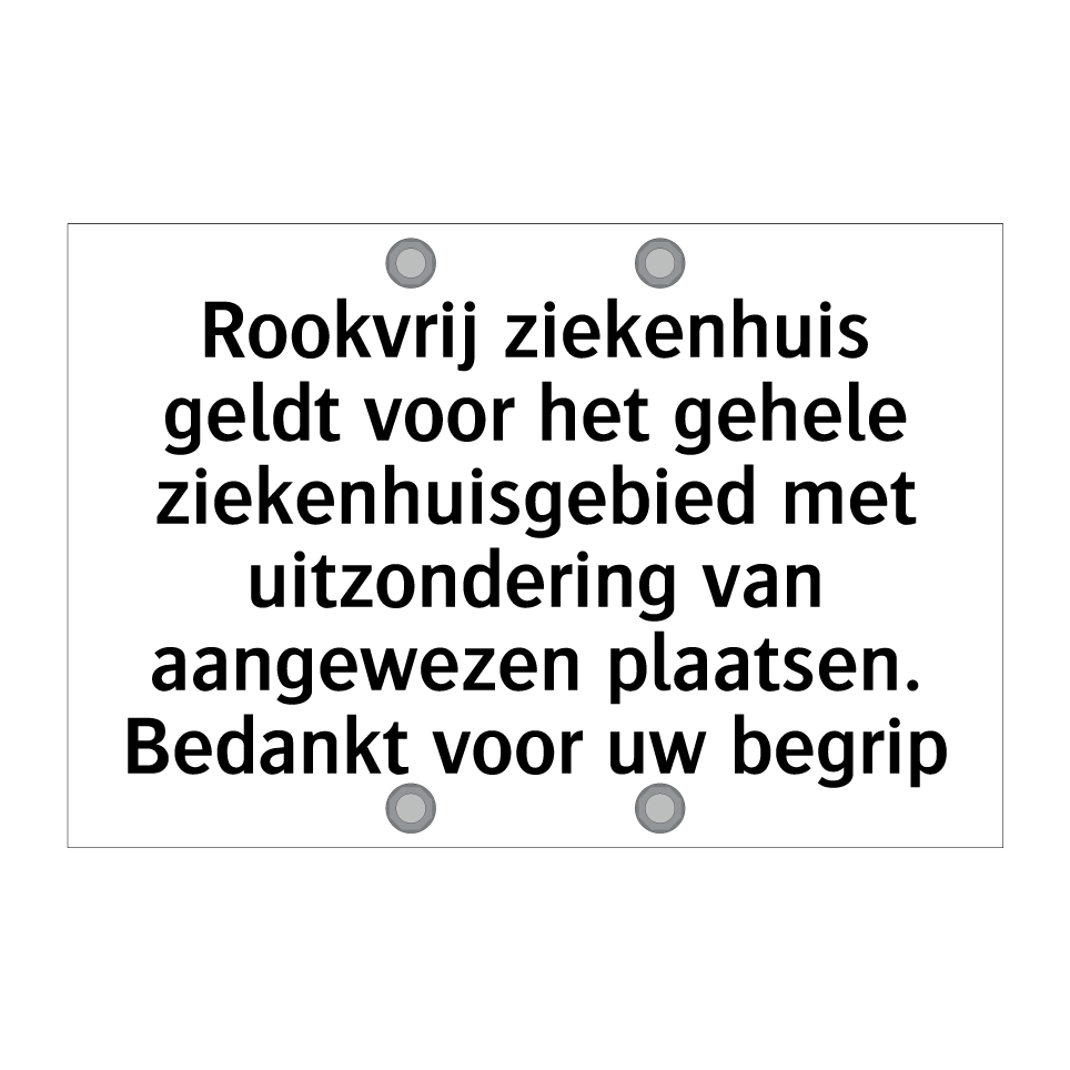 Verbodsbord met de tekst Rookvrij ziekenhuis geldt voor het gehele ziekenhuisgebied met uitzondering van aangewezen plaatsen. Bedankt voor uw begrip