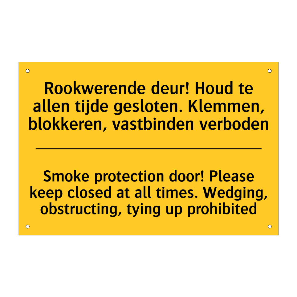 Waarschuwingsbord met de tekst Rookwerende deur! Houd te allen tijde gesloten. Klemmen, blokkeren, vastbinden verboden / Smoke protection door! Please keep closed at all times. Wedging, obstructing, tying up prohibited