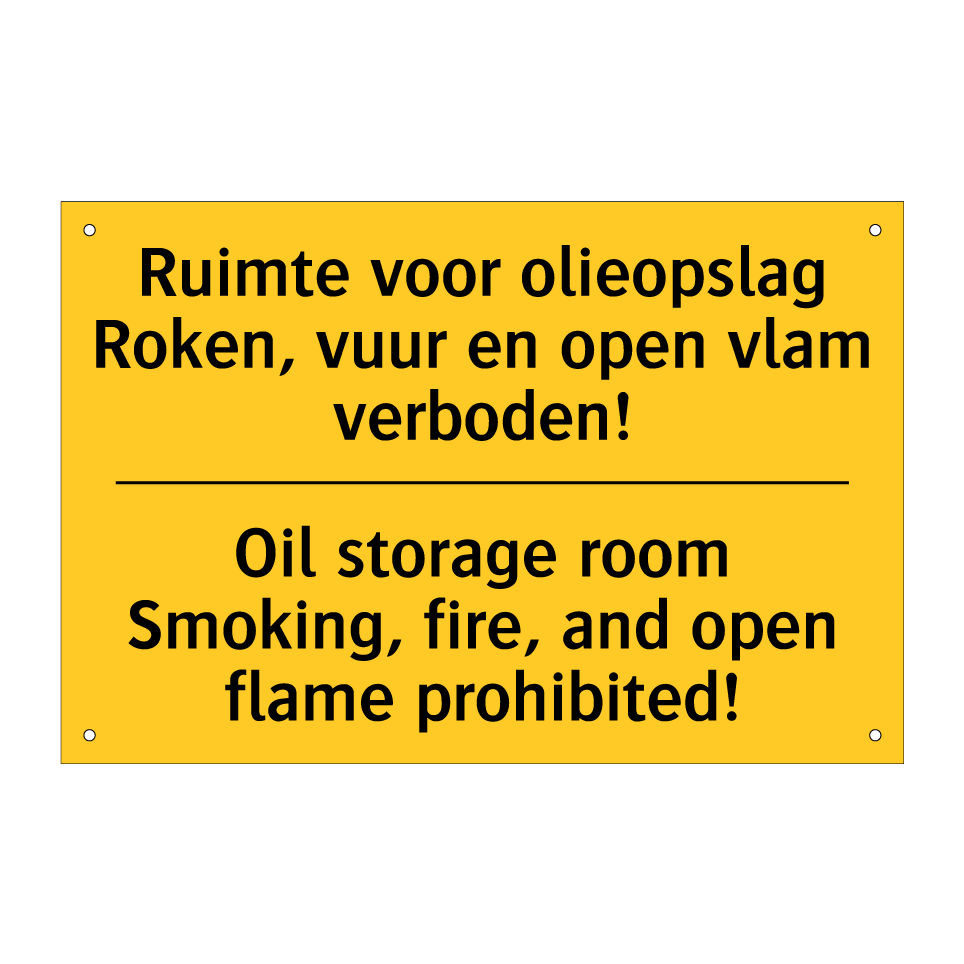 Waarschuwingsbord met de tekst Ruimte voor olieopslag Roken, vuur en open vlam verboden! / Oil storage room Smoking, fire, and open flame prohibited!