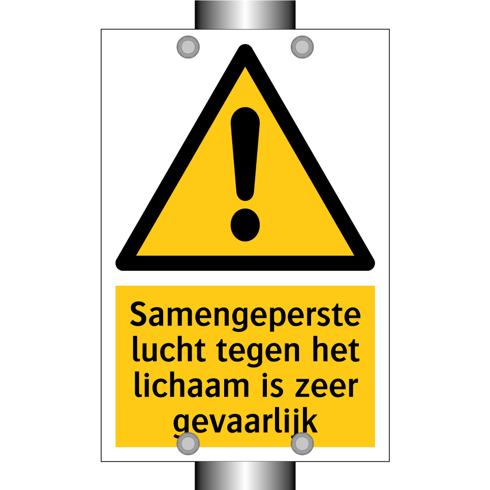 Waarschuwingsbord met de tekst Samengeperste lucht tegen het lichaam is zeer gevaarlijk