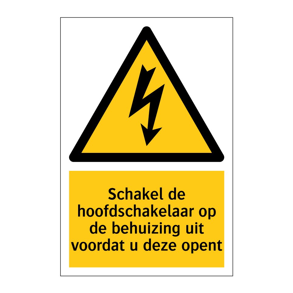 Waarschuwingsbord met de tekst Schakel de hoofdschakelaar op de behuizing uit voordat u deze opent