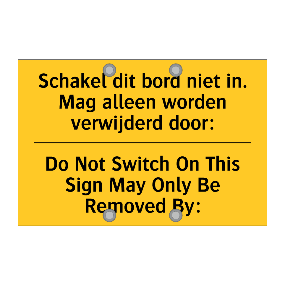 Waarschuwingsbord met de tekst Schakel dit bordje niet in. Mag alleen worden verwijderd door: / Do Not Switch On This Sign May Only Be Removed By: