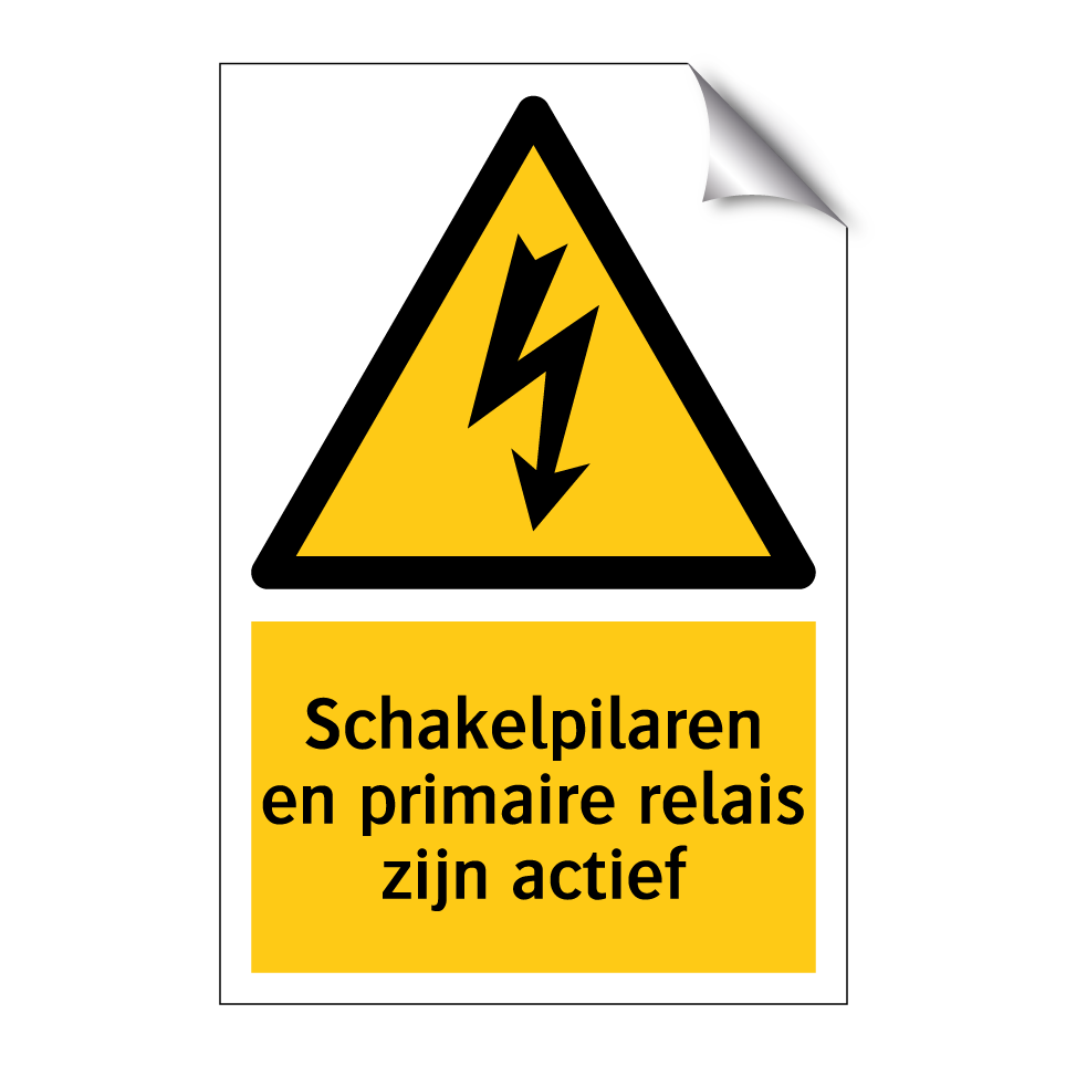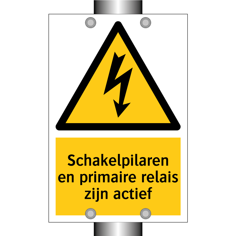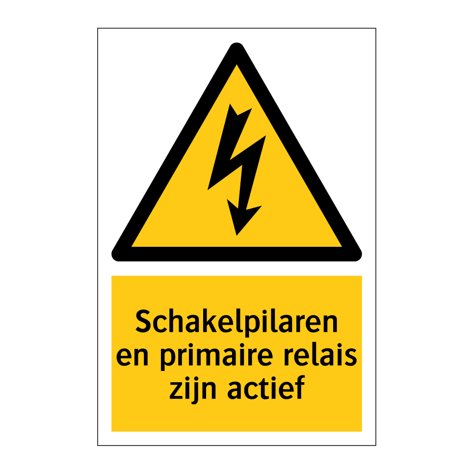Waarschuwingsbord met de tekst Schakelpilaren en primaire relais zijn actief