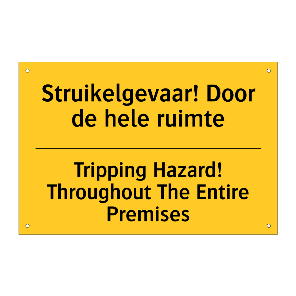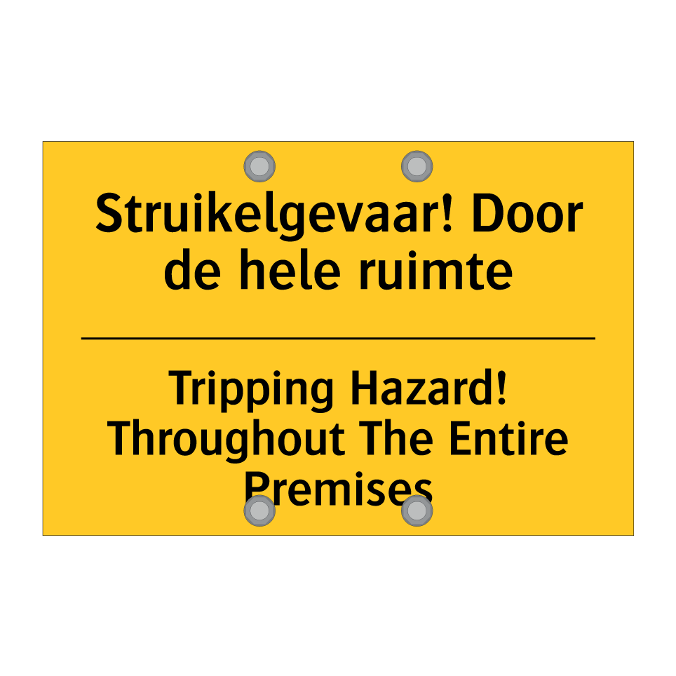Waarschuwingsbord met de tekst Struikelgevaar! Door de hele ruimte / Tripping Hazard! Throughout The Entire Premises