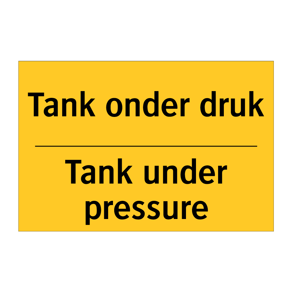 Dit waarschuwingsbord met gele achtergrond en zwarte tekst is ideaal voor het aangeven van een tank onder druk. De tweetalige tekst in zowel Nederlands als Engels zorgt voor duidelijke communicatie in internationale omgevingen. dit bordje is perfect voor gebruik in industriële omgevingen, fabrieken, en opslagruimtes waar drukvaten aanwezig zijn. Door de opvallende kleuren en duidelijke boodschap wordt de veiligheid verhoogd en worden ongelukken voorkomen. Plaats dit waarschuwingsbord op goed zichtbare locaties zoals bij ingangen, op tanks, of in de buurt van werkgebieden om personeel en bezoekers te waarschuwen voor mogelijke gevaren.