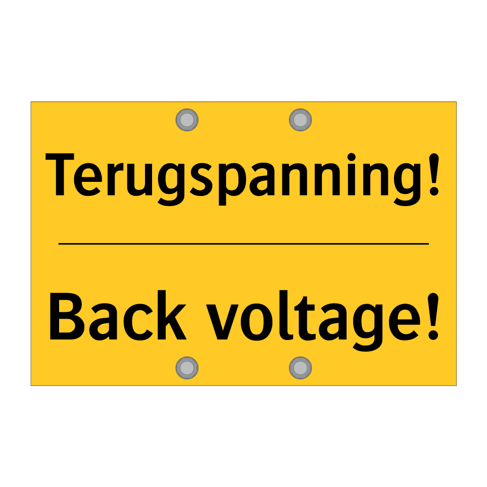 Waarschuwingsbord met de tekst Terugspanning! / Back voltage!