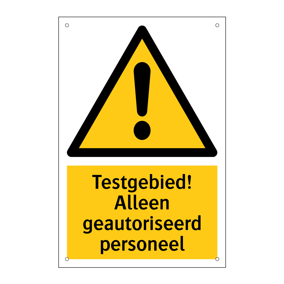 Deze waarschuwingsbord is essentieel voor het waarborgen van de veiligheid in testgebieden. Het bord geeft duidelijk aan dat alleen geautoriseerd personeel toegang heeft tot het gebied, waardoor onbevoegden worden geweerd. Plaats deze waarschuwingsbord bij ingangen van laboratoria, testfaciliteiten, of andere gecontroleerde omgevingen waar strikte toegangscontrole noodzakelijk is. Door het strategisch plaatsen van dit bordje, wordt het risico op ongelukken en ongewenste toegang aanzienlijk verminderd. Ideaal voor gebruik in industriële omgevingen, onderzoekscentra en andere locaties waar veiligheid en beveiliging van het grootste belang zijn.