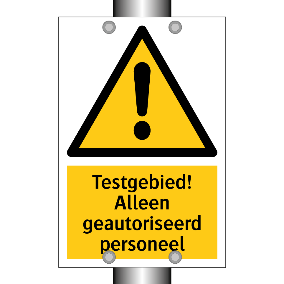 Waarschuwingsbord met de tekst Testgebied! Alleen geautoriseerd personeel