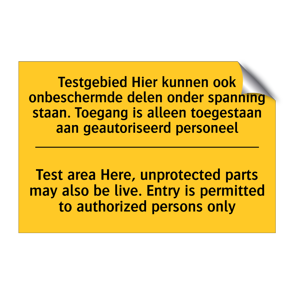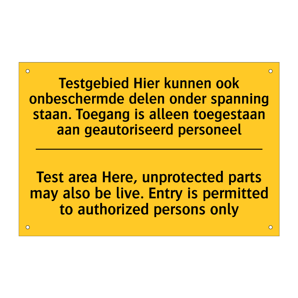 Waarschuwingsbord met de tekst Testgebied Hier kunnen ook onbeschermde delen onder spanning staan. Toegang is alleen toegestaan aan geautoriseerd personeel / Test area Here, unprotected parts may also be live. Entry is permitted to authorized persons only