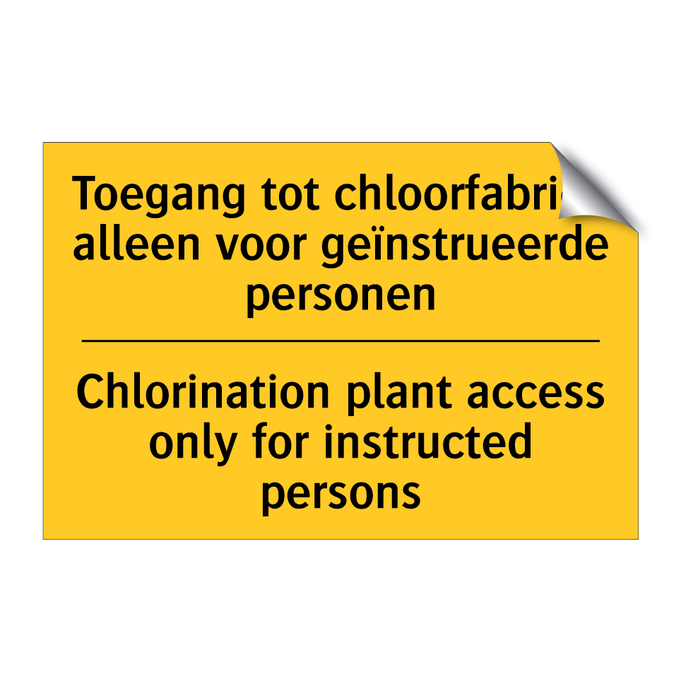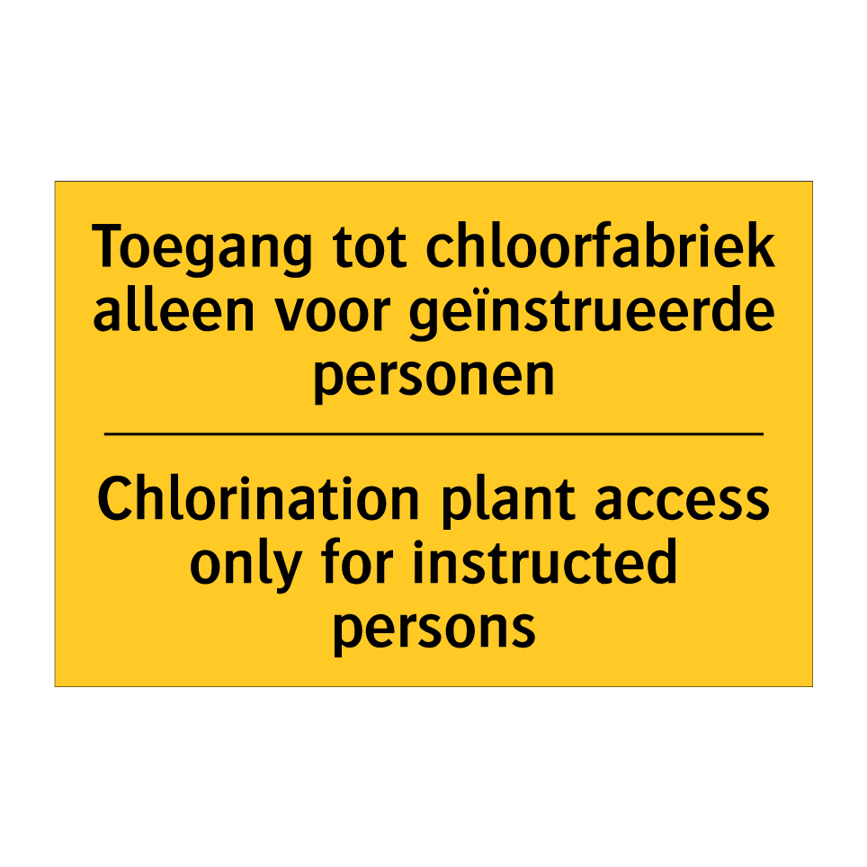 Dit waarschuwingsbord is essentieel voor de veiligheid in en rondom een chloorfabriek. Het bord, met een gele achtergrond en zwarte tekst, geeft duidelijk aan dat toegang alleen is toegestaan voor geïnstrueerde personen. Dankzij de tweetalige tekst in zowel Nederlands als Engels, is het bord ideaal voor internationale omgevingen en zorgt het voor een bredere begrijpelijkheid. Plaats dit waarschuwingsbord bij ingangen, hekken of andere toegangswegen naar de chloorfabriek om onbevoegden te waarschuwen en de veiligheid te waarborgen. dit bordje helpt bij het voorkomen van ongelukken en zorgt ervoor dat alleen getrainde personen toegang hebben tot de gevaarlijke zones.