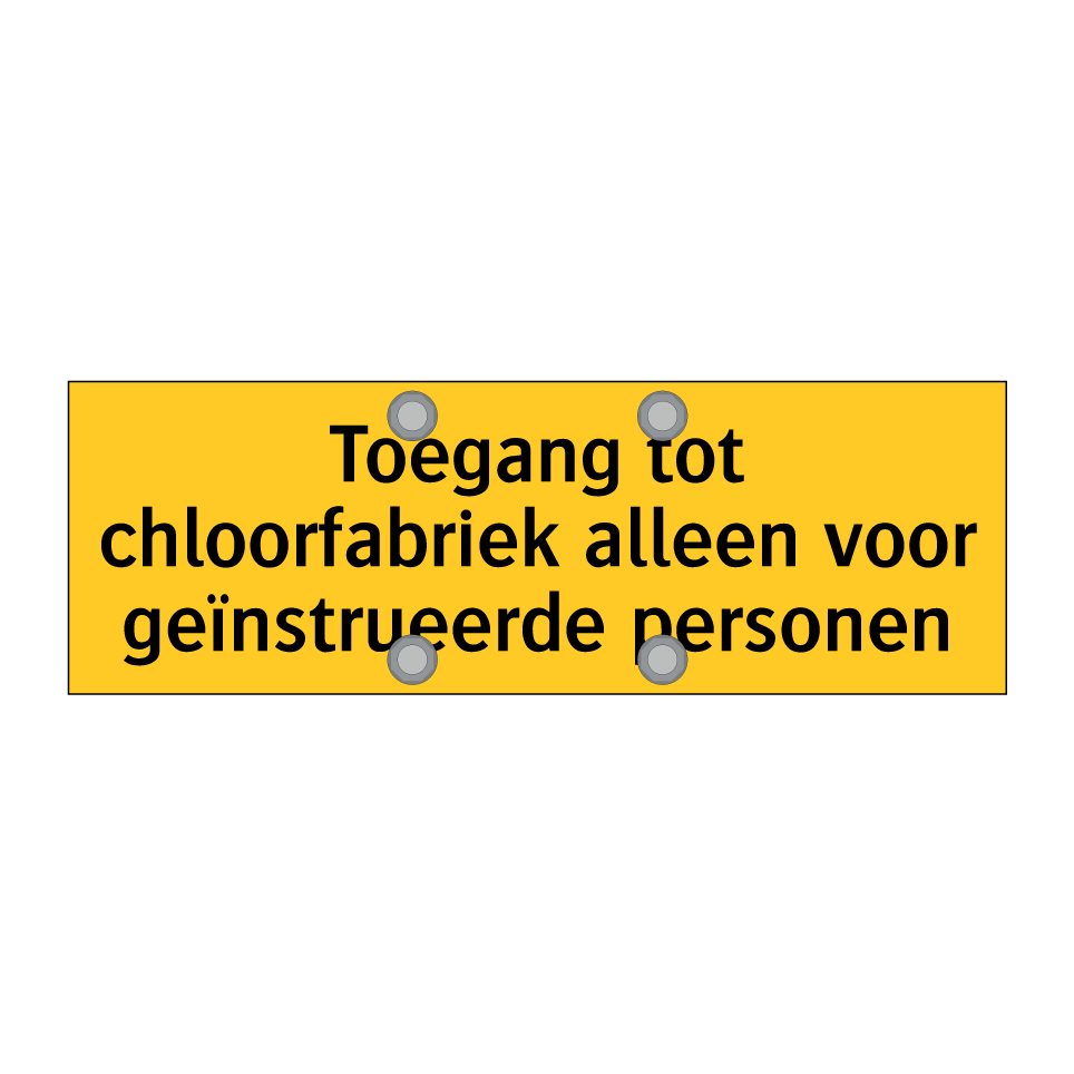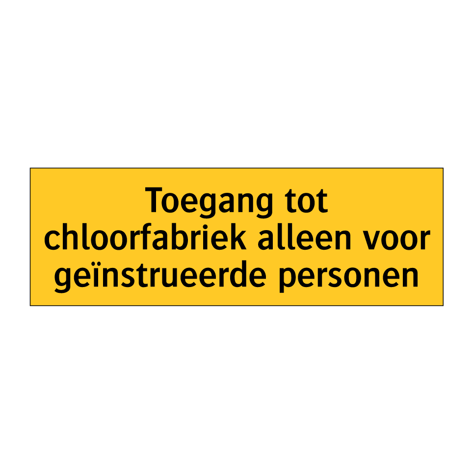 Deze waarschuwingsbord is essentieel voor de veiligheid in en rondom chloorfabrieken. Het bord geeft duidelijk aan dat alleen geïnstrueerde personen toegang hebben tot het gebied, wat helpt om ongeautoriseerde toegang te voorkomen en de veiligheid te waarborgen. Plaats deze waarschuwingsbord bij ingangen, hekken, en andere toegangswegen naar de chloorfabriek om ervoor te zorgen dat iedereen op de hoogte is van de toegangsbeperkingen. dit bordje is ideaal voor gebruik in industriële omgevingen waar strikte veiligheidsprotocollen noodzakelijk zijn. Door de opvallende gele achtergrond en zwarte tekst is de boodschap duidelijk zichtbaar en gemakkelijk te begrijpen.