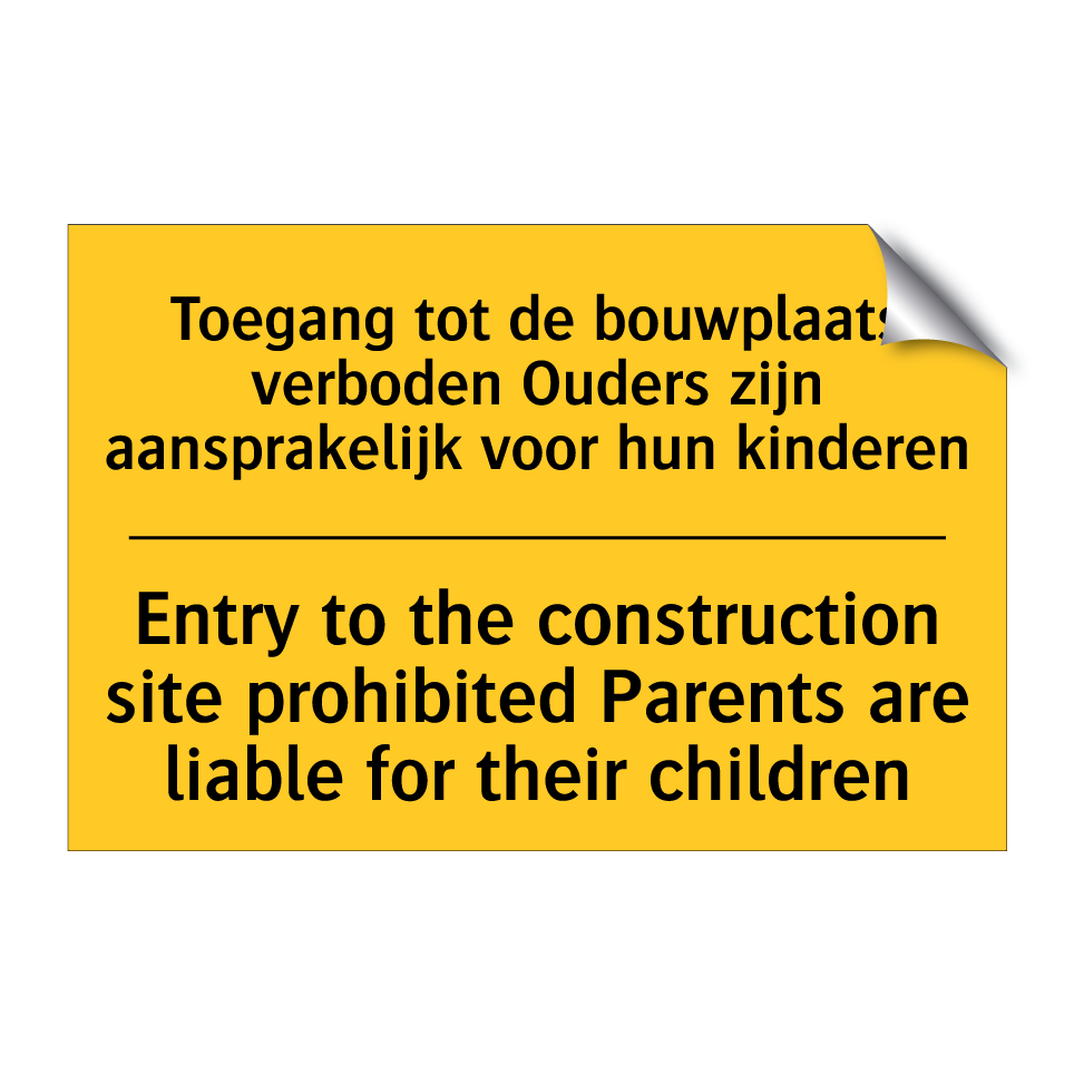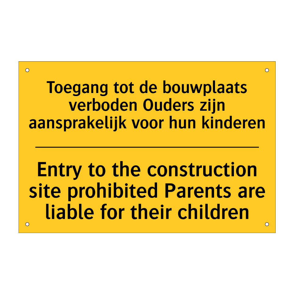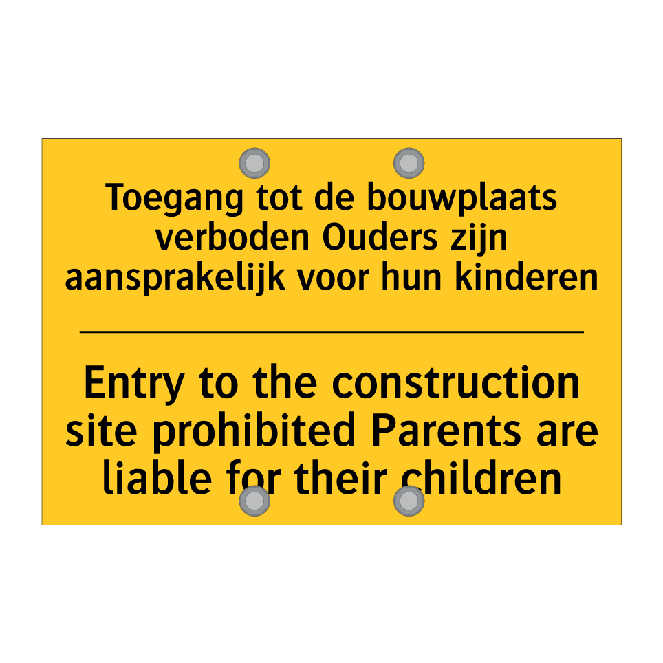 Waarschuwingsbord met de tekst Toegang tot de bouwplaats verboden Ouders zijn aansprakelijk voor hun kinderen / Entry to the construction site prohibited Parents are liable for their children