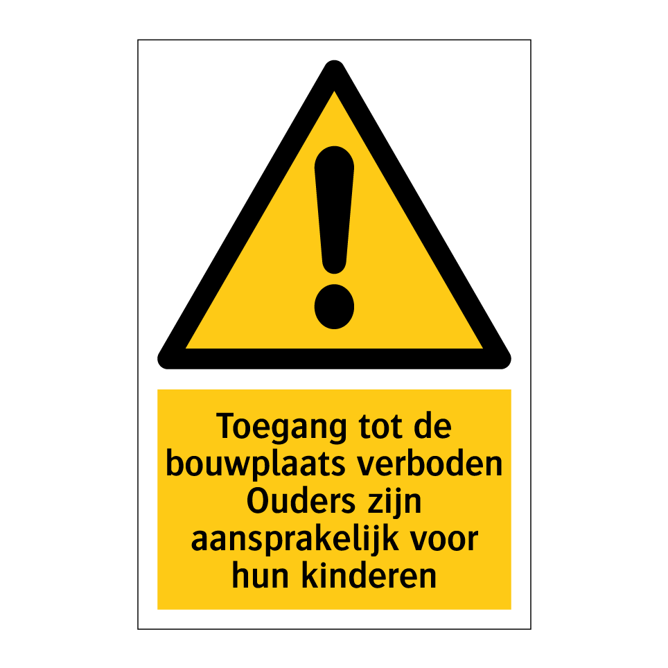 Deze waarschuwingsbord is essentieel voor bouwplaatsen om de veiligheid te waarborgen. Het bord informeert duidelijk dat de toegang tot de bouwplaats verboden is en benadrukt de verantwoordelijkheid van ouders voor hun kinderen. Plaats dit waarschuwingsbord bij ingangen, hekken of andere toegangswegen naar de bouwplaats om ongeautoriseerde toegang te voorkomen. dit bordje is ideaal voor bouwbedrijven, aannemers en projectleiders die de veiligheid van hun werkterrein willen handhaven. Door het strategisch te plaatsen, minimaliseer je het risico op ongelukken en zorg je voor een veilige werkomgeving.