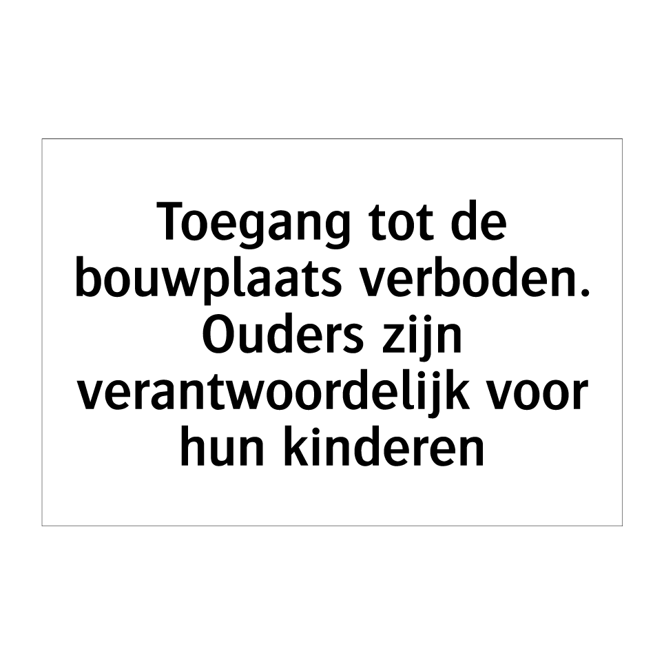 Deze opvallende verbodsbord is essentieel voor het waarborgen van de veiligheid op bouwplaatsen. Het waarschuwt duidelijk dat toegang tot de bouwplaats niet is toegestaan, en benadrukt de verantwoordelijkheid van ouders voor hun kinderen. Ideaal voor gebruik bij ingangen van bouwterreinen, deze bord kan strategisch worden geplaatst bij hekken, poorten of andere toegangswegen om ongeautoriseerde toegang te voorkomen. Door het gebruik van duidelijke en directe taal, helpt dit bord om potentiële gevaren te minimaliseren en de veiligheid van zowel volwassenen als kinderen te waarborgen. Perfect voor bouwbedrijven die veiligheid hoog in het vaandel hebben staan.