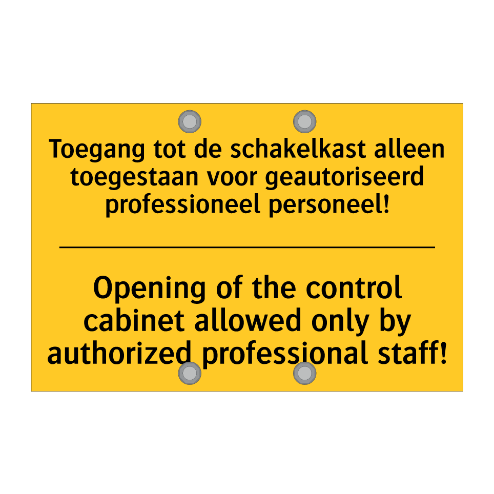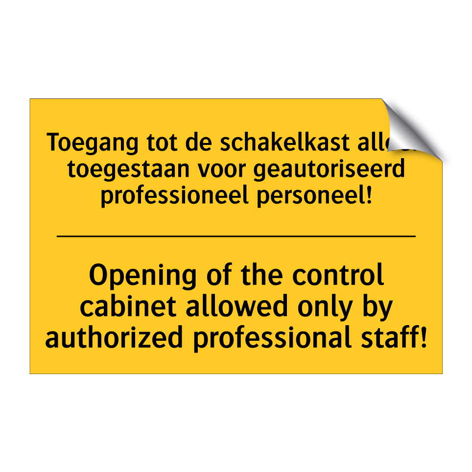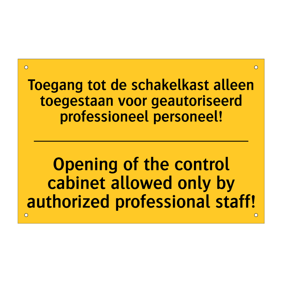 Waarschuwingsbord met de tekst Toegang tot de schakelkast alleen toegestaan voor geautoriseerd professioneel personeel! / Opening of the control cabinet allowed only by authorized professional staff!